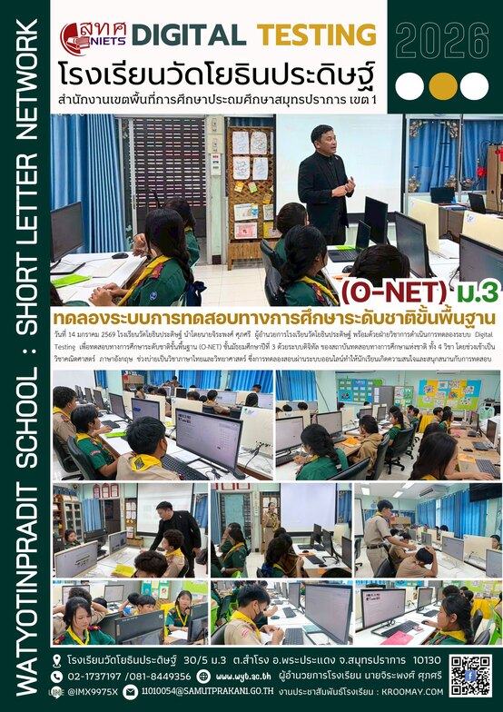วันที่ 14 มกราคม 2569 โรงเรียนวัดโยธินประดิษฐ์ นำโดยนายจิระพงศ์ ศุภศรี ผู้อำนวยการโรงเรียนวัดโยธินประดิษฐ์ พร้อมด้วยฝ่ายวิชาการดำเนินการทดลองระบบ Digital Testing เพื่อทดสอบทางการศึกษาระดับชาติขั้นพื้นฐาน (O-NET) ชั้นมัธยมศึกษาปีที่ 3 ด้วยระบบดิจิทัล ของสถาบันทดสอบทางการศึกษาแห่งชาติ ทั้ง 4 วิชา โดยช่วงเช้าเป็นวิชาคณิตศาสตร์ ภาษาอังกฤษ ช่วงบ่ายเป็นวิชาภาษาไทยและวิทยาศาสตร์ ซึ่งการทดลองสอบผ่านระบบออนไลน์ทำให้นักเรียนเกิดความสนใจและสนุกสนานกับการทดสอบ