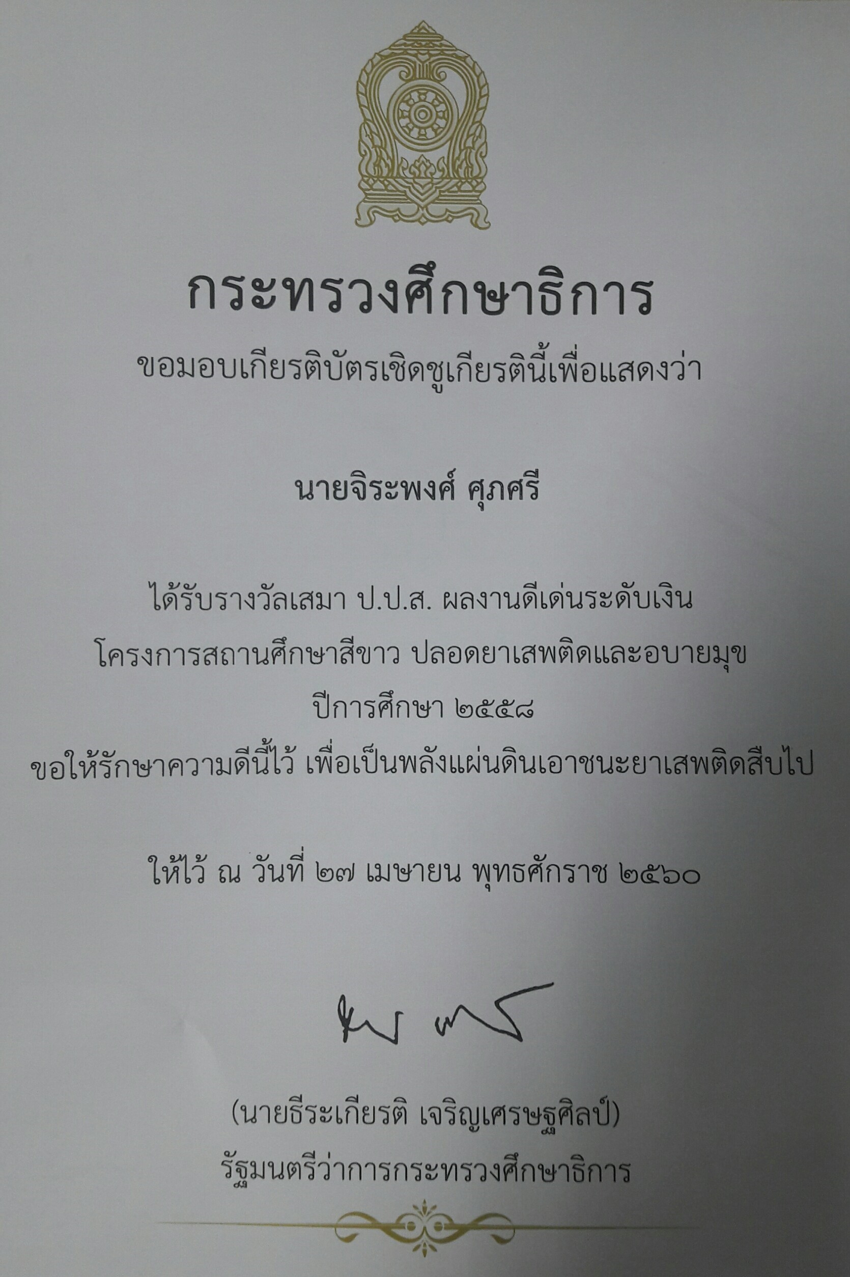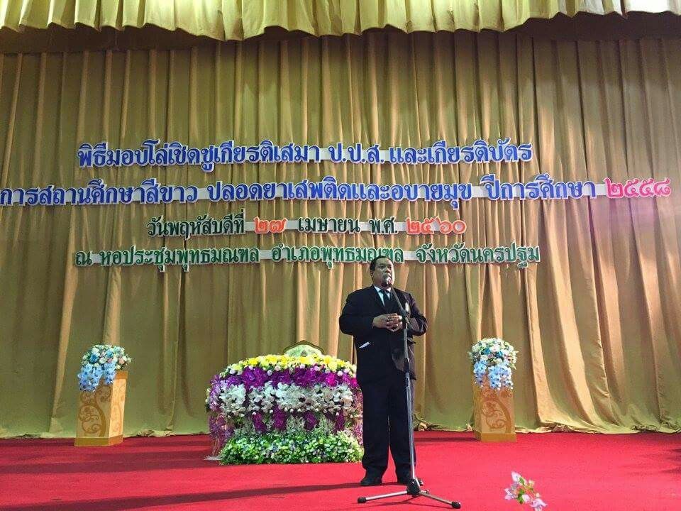 ผอ.จิระพงศ์ ศุภศรี รับโล่เชิดชูเกียรติเสมาปปส."โครงการสถานศึกษาสีขาว ปลอดยาเสพติดและอบายมุข" จากมล.ปนัดดา ดิษกุล รมช.ศธ