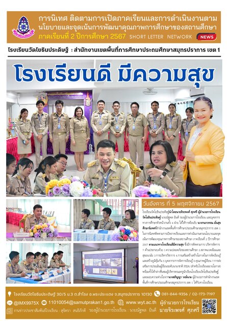 วันที่ 5 พฤศจิกายน 2567 โรงเรียนวัดโยธินประดิษฐ์ นำโดยนายจิระพงศ์ ศุภศรี ผู้อำนวยการโรงเรียนวัดโยธินประดิษฐ์ พร้อมด้วยคณะครู ให้การต้อนรับ นางกนกวรรณ มั่นสุข ศึกษานิเทศก์ สำนักงานเขตพื้นที่การศึกษาประถมศึกษาสมุทรปราการ เขต 1 ในการนิเทศ ติดตามการเปิดภาคเรียนและการดำเนินงานตามนโยบายและจุดเน้นการพัฒนาคุณภาพการศึกษาของสถานศึกษา ภาคเรียนที่ 2 ปีการศึกษา 2567 ตามแนวทาง #โรงเรียนดีมีความสุข ซึ่งติดตามการบริหารจัดการ 7 ด้าน ประกอบด้วย 1.ด้านความปลอดภัยของสถานศึกษา 2.ด้านสภาพแวดล้อมและสุขอนามัย 3.ด้านการบริหารวิชาการ 4.ด้านการเสริมสร้างสร้างโอกาสในการจัดเรียนรู้และสร้างภูมิคุ้มกัน 5.ด้านบุคลากร/การจัดการเรียนรู้ 6.ด้านคุณภาพผู้เรียน 7.ด้านการส่งเสริมการประเมินผู้เรียนระดับนานาชาติ PISA (สำหรับโรงเรียนขยายโอกาส)